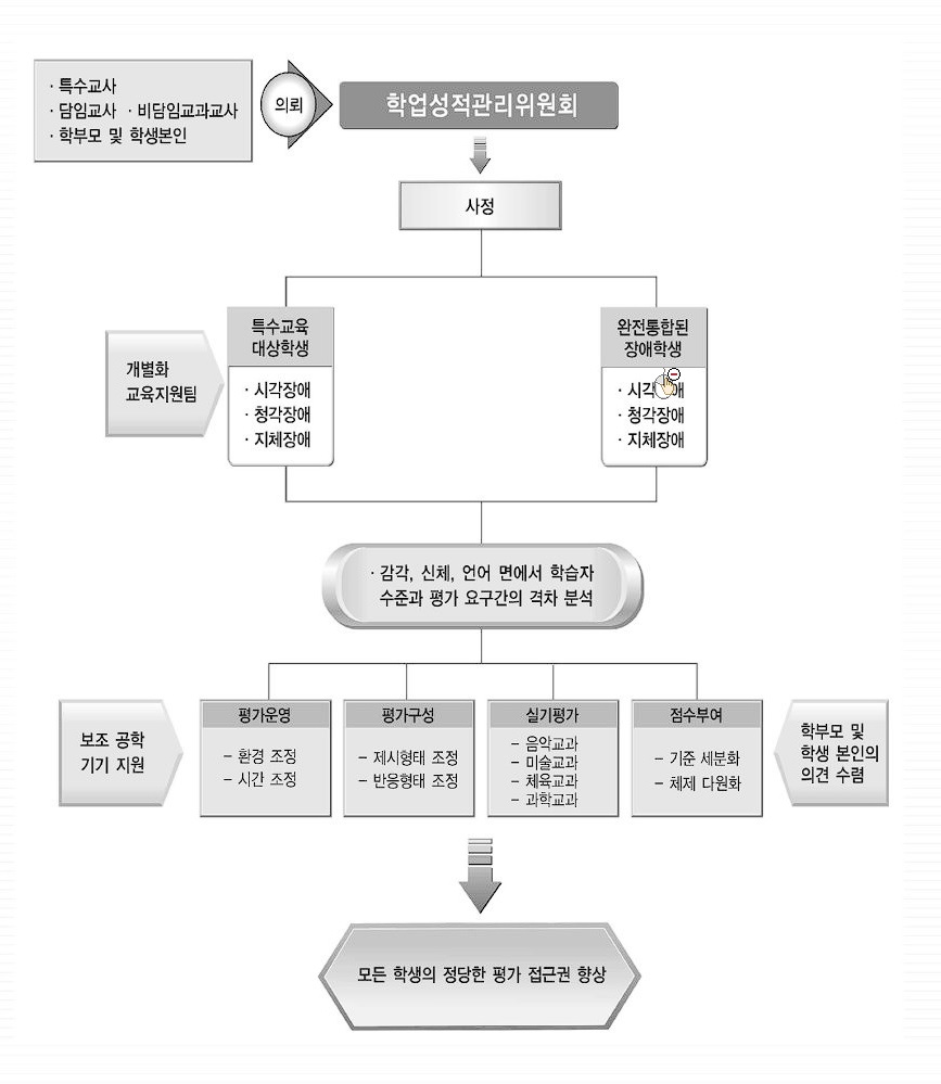 각급 학교의 학업성적관리위원회에서는 위의 절차에 따라 장애 학생에 대한 정당한 평가가 이루어지도록 평가 조정을 실시합니다. 장애 학생이라고 해서 무조건 평가 조정을 제공하는 것은 아니며, 정당한 편의를 제공하여 장애 학생이 학습한 것을 정확하게 평가받을 수 있을 때 제공합니다. 특수교육 대상자로 선정된 학생은 개별화교육 지원팀에서 각 학생에게 적합한 평가 조정 방법을 지원합니다.