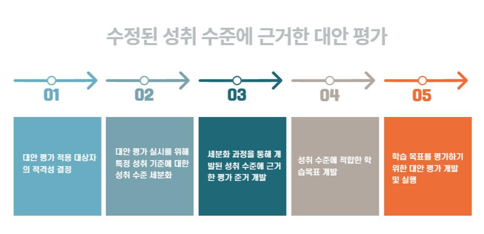 | 대체 성취 기준에 근거한 대안 평가 | - 장애 정도가 중증이거나 학년 수준의 학업 성취를 기대하기 어려운 학생 | - 학년 수준 성취 기준에 부합되면서도 매우 관대한 성취 수준 또는 대체 성취 기준을 적용함. - 기본 교육과정의 성취 기준, 성취 수준 |