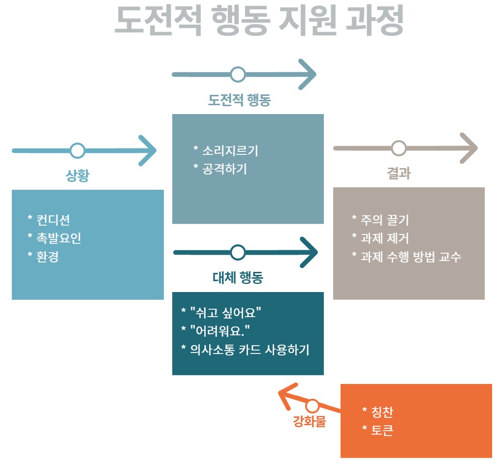 도전적 행동의 기능을 파악했다면 도전적 행동에 비해 좀 더 받아들여지기 쉬운 다른 행동은 무엇일지, 도전적 행동과 같은 결과를 얻을 수 있을지 생각해보아야 합니다. 예를 들면, 위의 그림에서 도전적 행동인 소리를 지르는 행동이나 공격 행동의 대체 행동은 "쉬고 싶어요."나 "어려워요.", 의사소통 카드(음성언어 사용이 어려운 경우) 사용하기 등이 있습니다.