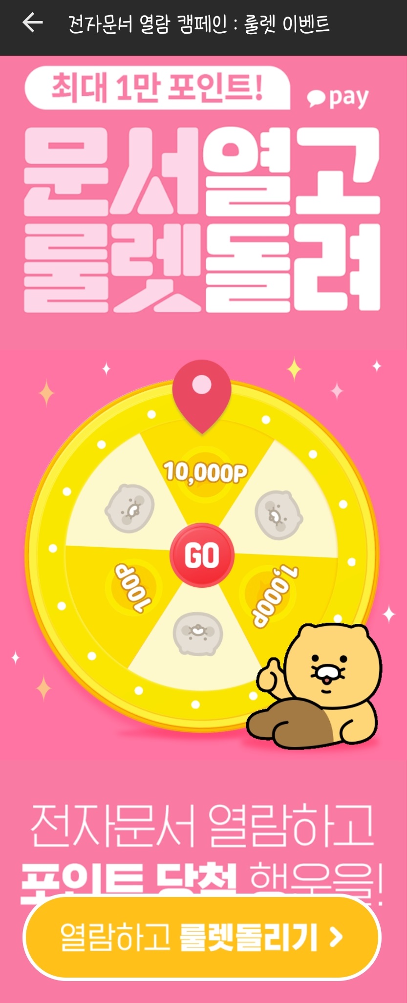 6월 말까지만 카카오페이로 전자문서를 받을 경우 이벤트를 통해 포인트를 적립받을 수 있습니다. 저는 전기요금 청구서를 카카오페이 청구서 받기로 해두었는데, 이벤트를 몰라서 얼마 전 한 번에 확인했습니다. 10,000포인트 한번, 나머지는 1,000포인트, 100포인트를 받았고 꽝(춘식이 얼굴)도 여러 번 나왔습니다. '이런 이벤트에서 꽝이라니!!'라는 생각도 들었지만 받은 포인트로 카카오 선물하기에서 커피 쿠폰을 구매해서 소소한 즐거움을 느꼈습니다.