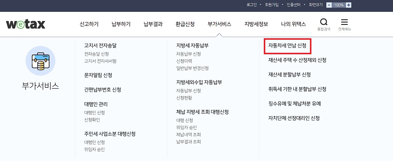 연납(선납)을 하기 위해서는 연납 신청 기간에 주거지의 세정과나 출장소 등을 통해서 신청하거나, 위택스 홈페이지에서 연납 신청을 하시면 됩니다. 신고하기 탭에서 자동차세를 클릭하거나 부가서비스에서 자동차세 연납 신청하기를 할 수 있으니 아래 그림을 참고하시기 바랍니다.