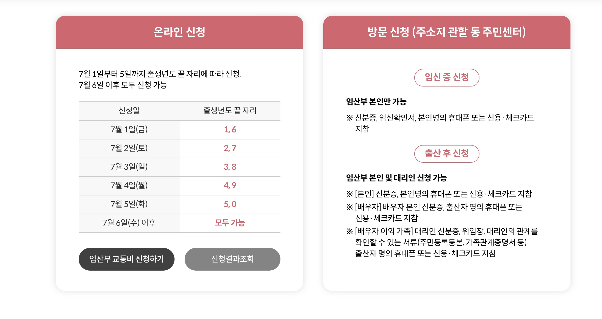 서울시 임산부 교통비 지원 홈페이지에서 별도의 서류 제출 없이 신청 가능합니다. 임신 기간 중 신청하는 경우에는 임신 여부 확인을 위해 정부 24 맘 편한 임신 신청에서 '지방자치단체 서비스-서울시 임산부 교통비 지원'을 먼저 신청해야 합니다. 7월 1일(금)부터 5일(화)까지 출생 연도 끝자리에 따라 5부제로 나누어 신청하며, 7월 6일 이후에는 출생연도와 관계없이 신청 가능합니다.