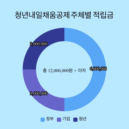청년내일채움공제는 청년이 중소기업에서 오래 근속할 수 있도록 기업과 정부에서 일정 금액을 지원해주는 제도입니다. 정확히는 청년이 2년간 매월 12만 5천 원씩 총 300만 원을 적립하면 정부에서 600만 원, 기업에서 300만 원(정부 지원)을 공동 적립해주는 제도입니다. 적어도 2년간 취업한 중소기업에서 근무해야 청년내일채움공제를 적용받을 수 있습니다. 2년 후 만기 공제금은 '1,200만 원+이자'가 되며, 만기 후 중소벤처기업부의 내일채움공제(3~5년)로 연장 가입하면 최대 8년 동안 장기적인 목돈 마련이 가능합니다.