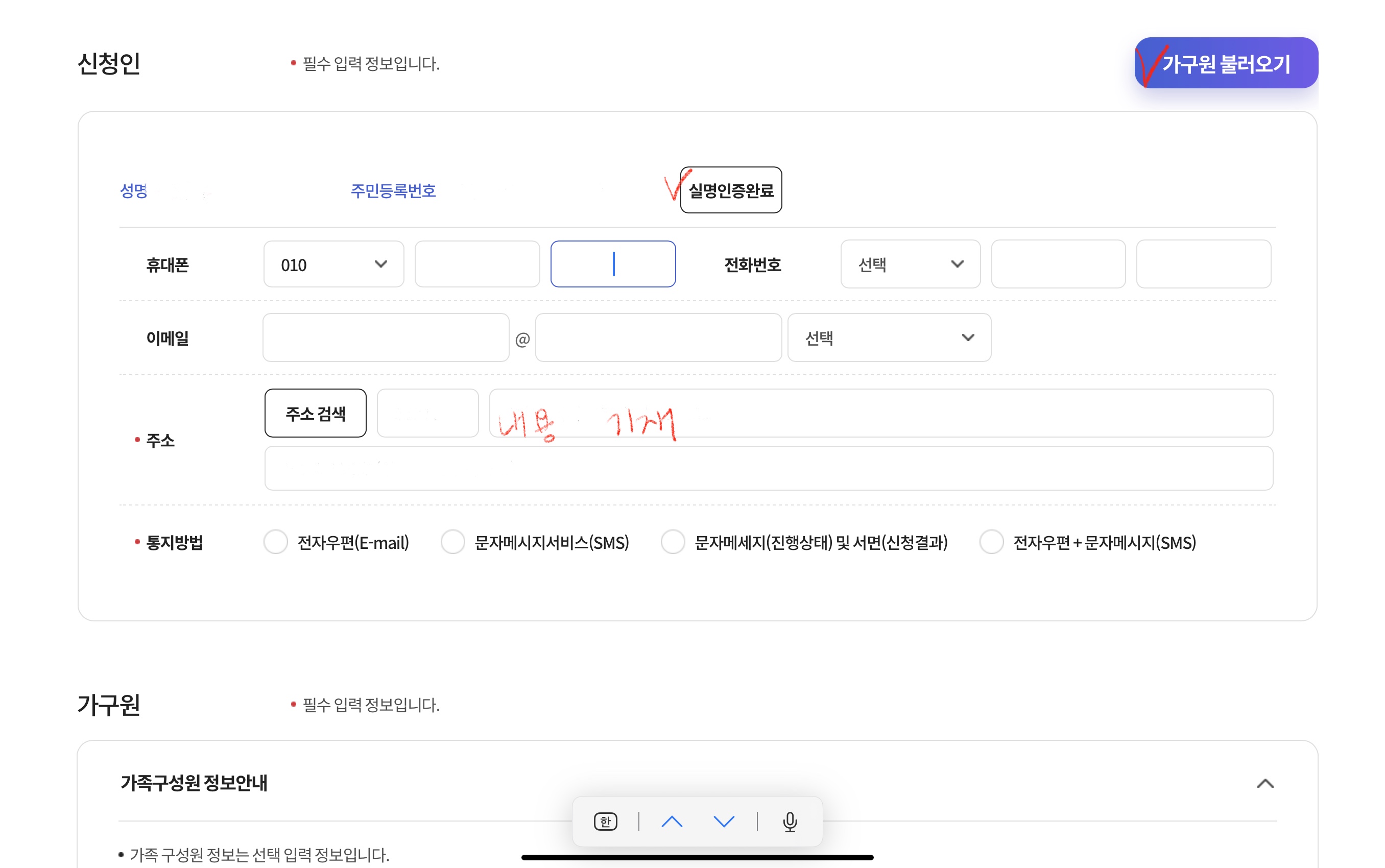 3. 신청인 정보를 입력하고 가구원 불러오기 후 가족 구성원 정보를 입력합니다.