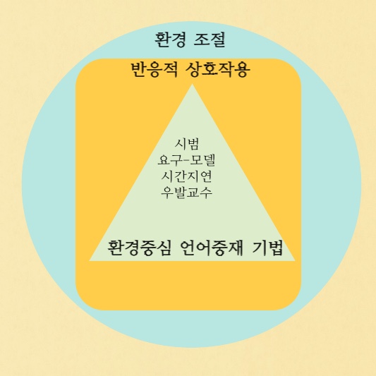 강화된 환경 중심 언어 중재는 환경 중심 의사소통 중재 기법, 반응적 상호작용, 환경조절이라는 세 가지 요소로 구성되어 있습니다.