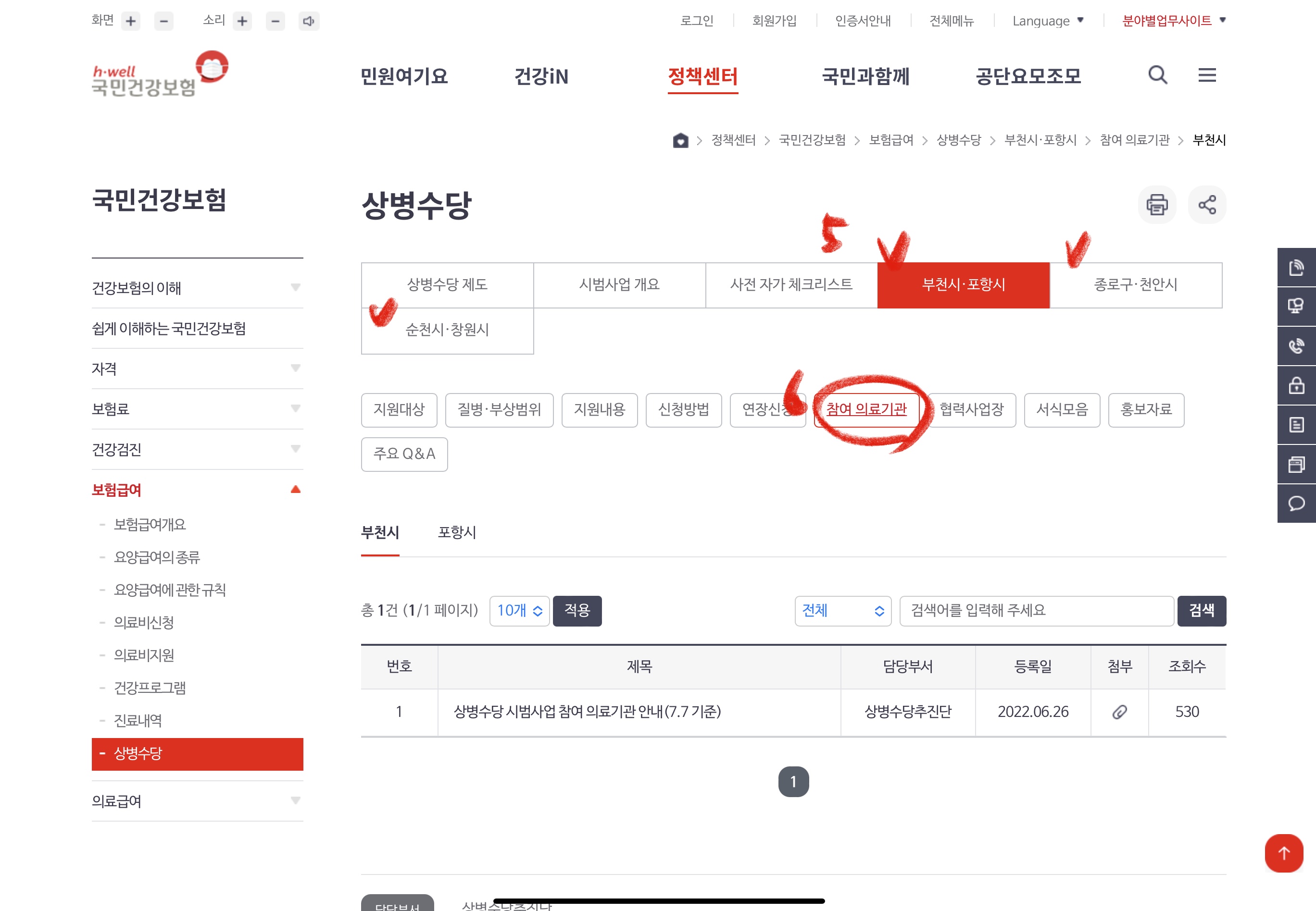 상병이 발생하면 시범 사업 지역 상병 수당 참여 의료기관에 방문해서 '사전 문답서'를 작성하고, '상병수당 심사용 진단서(15,000원)' 및 필요한 의무기록지를 발급받습니다. 상병수당 진단서 비용은 수급대상으로 확정되면 100% 환급받을 수 있으며, 연장 신청서는 50% 환급받을 수 있습니다. 진단서를 발급받을 수 있는 의료기관은 아래 그림의 순서대로 확인하시면 됩니다.